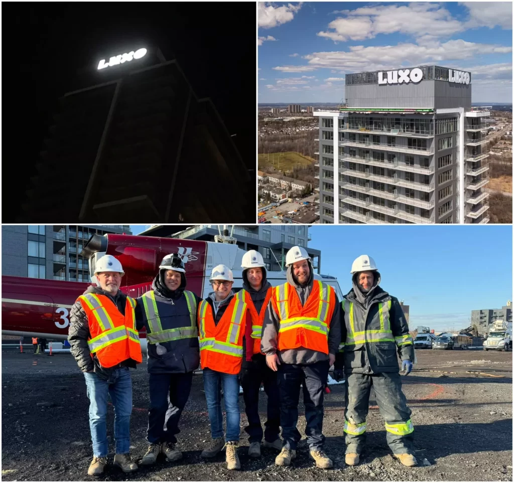 In June 2023, DMA approached Posimage with the request: develop and install three series of eight-foot-high illuminated channel letters, perched an astounding 111.8 m (367 ft) above ground level. The signage would become the defining crown of the new LUXO tower. A second phase—featuring a pylon and additional ground-level channel letters—is scheduled for 2026.